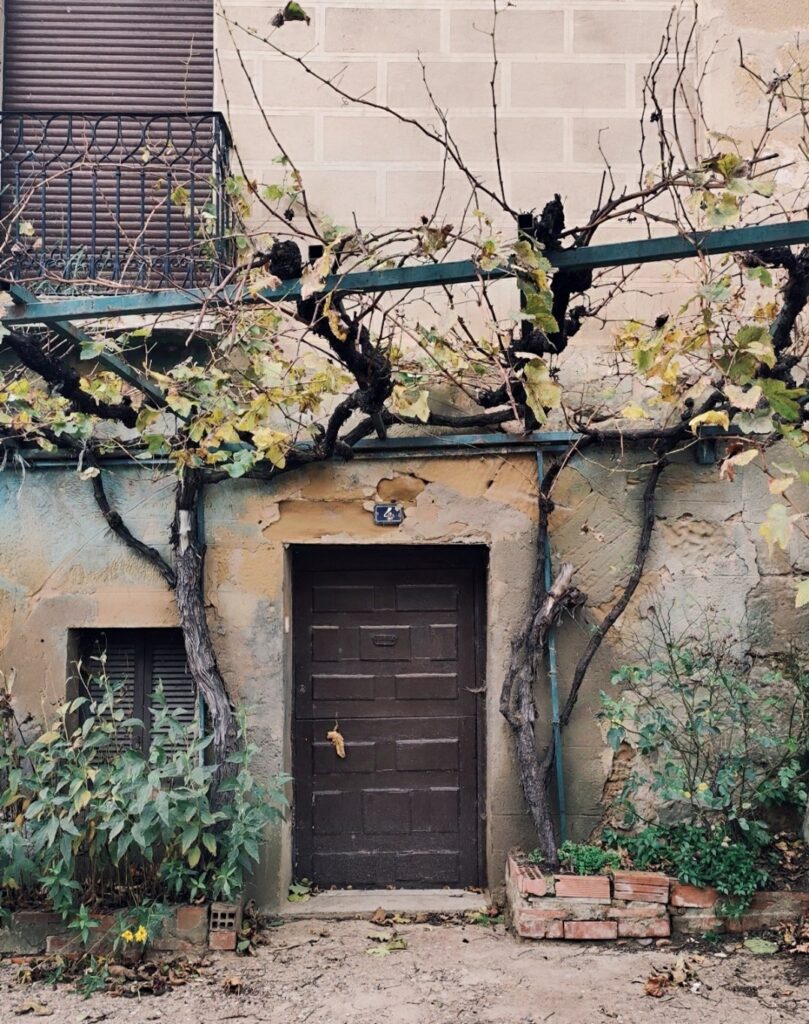 No la mandorla con querubines, ni el poderoso puño de hierro, sí la delicada hoja de parra en precario equilibrio. También la fina aldaba silenciosa en una invitación a no llamar, a contemplar la fachada en la prudente distancia. Ves los bancales de ladrillo, la naturaleza reptando por la pared sin encontrar el auxilio de la ventana. Incluso el número resulta una víctima más del tiempo que no deja nada inmaculado en su poso de herrumbre. Crees que vences el tiempo con una foto porque atrapas el momento. Será una más de las miles de fotos arrumbadas en el móvil.