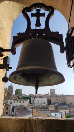 ¿Y si te acoges a sagrado? te preguntas, azuzado por la calorina que hace fuera, y derrite los sillares de piedra del casco antiguo cacereño. Pagas la entrada, pegas el audioguía a la oreja, constatas por primera vez en toda tu vida que estás sudando dentro de una iglesia. Pruebas en las capillas con el mismo resultado. A calzón quitado asciendes al campanario. Recibes una bofetada de calor. Nunca has tenido una campana tan a mano. Ardes en deseos (será por el calor) de hacerla tañer. Quieres sentir el badajo entre las manos. Hacer mucho ruido, manifestar tu creciente malestar.