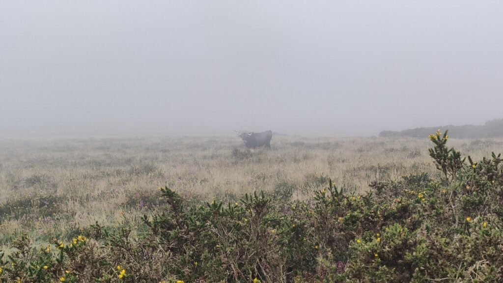 Sabías de la existencia de toros enamorados de la luna, pero no de vacas enamoradas de la niebla, como la que te mira estática en la distancia. Hablas de amor, pero ¿y si fuese también una víctima de la adversa climatología? Ajustas las gafas y tratas de dictaminar si es bizca, zurda, gacha, estorneja… Una cuestión de cuernos que te resulta irresoluble, porque cuando vuelves a mirar ya ha desaparecido entre el velo de niebla. Ves jirones de montaña, el camino recortado, el lánguido sol tratando de hacerse un hueco entre tan nube. ¿Llegarás al coche antes de la anochecida?